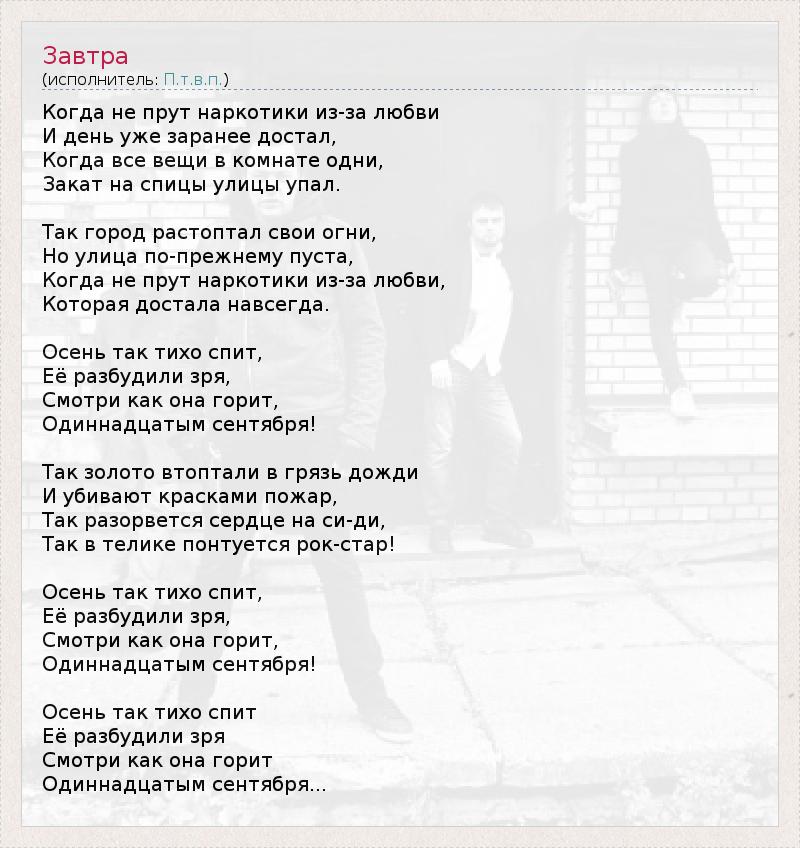 Когда не прут наркотики из-за любви И день уже заранее достал, Когда все вещи в комнате одни, Закат на спицы улицы упал. Так город растоптал свои огни, Но улица по-прежнему пуста, Когда не прут наркотики из-за любви, Которая достала навсегда. Осень так тихо спит, Её разбудили зря, Смотри как она горит, Одиннадцатым сентября! Так золото втоптали в грязь дожди И убивают красками пожар, Так разорвется сердце на си-ди, Так в телике понтуется рок-стар! Осень так тихо спит, Её разбудили зря, Смотри как она горит, Одиннадцатым сентября! Осень так тихо спит Её разбудили зря Смотри как она горит Одиннадцатым сентября...