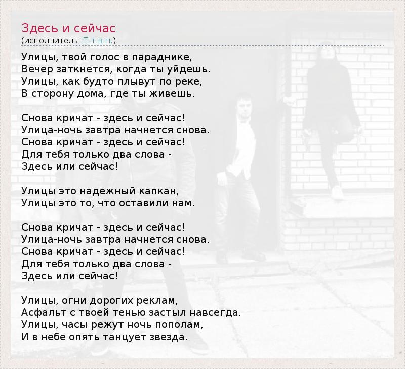 Улицы, твой голос в параднике, Вечер заткнется, когда ты уйдешь. Улицы, как будто плывут по реке, В сторону дома, где ты живешь. Снова кричат - здесь и сейчас! Улица-ночь завтра начнется снова. Снова кричат - здесь и сейчас! Для тебя только два слова - Здесь или сейчас! Улицы это надежный капкан, Улицы это то, что оставили нам. Снова кричат - здесь и сейчас! Улица-ночь завтра начнется снова. Снова кричат - здесь и сейчас! Для тебя только два слова - Здесь или сейчас! Улицы, огни дорогих реклам, Асфальт с твоей тенью застыл навсегда. Улицы, часы режут ночь пополам, И в небе опять танцует звезда.