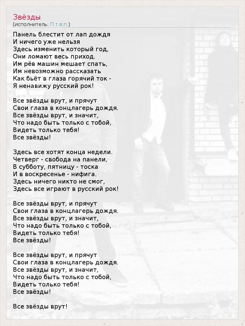 Панель блестит от лап дождя И ничего уже нельзя Здесь изменить который год, Они ломают весь приход. Им рёв машин мешает спать, Им невозможно рассказать Как бьёт в глаза горячий ток - Я ненавижу русский рок! Все звёзды врут, и прячут Свои глаза в концлагерь дождя. Все звёзды врут, и значит, Что надо быть только с тобой, Видеть только тебя! Все звёзды! Здесь все хотят конца недели. Четверг - свобода на панели, В субботу, пятницу - тоска И в воскресенье - нифига. Здесь ничего никто не смог, Здесь все играют в русский рок! Все звёзды врут, и прячут Свои глаза в концлагерь дождя. Все звёзды врут, и значит, Что надо быть только с тобой, Видеть только тебя! Все звёзды! Все звёзды врут, и прячут Свои глаза в концлагерь дождя. Все звёзды врут, и значит, Что надо быть только с тобой, Видеть только тебя! Все звёзды! Все звёзды врут!