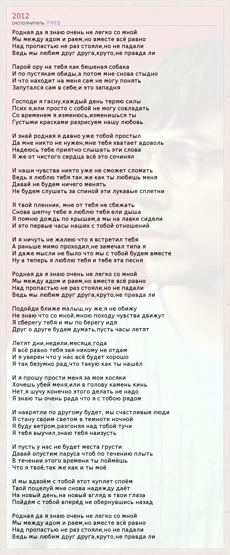 Родная да я знаю очень не легко со мной Мы между адом и раем,но вместе всё равно Над пропастью не раз стояли,но не падали Ведь мы любим друг друга,круто,не правда ли Парой ору на тебя как бешеная собака И по пустякам обиды,а потом мне снова стыдно И что находит на меня сам не могу понять Запутался сам в себе,и это западня Господи я гасну,каждый день теряю силы Псих я,или просто с собой не могу совладать Со временем я изменюсь,изменишься ты Густыми красками разрисуем нашу любовь И знай родная я давно уже тобой простыл Да мне никто не нужен,мне тебя хватает вдоволь Надеюсь тебе приятно слышать эти слова Я же от чистого сердца всё это сочинял И наши чувства никто уже не сможет сломать Ведь я люблю тебя так же как ты любишь меня Давай не будем ничего менять Не будем слушать за спиной эти лукавые сплетни Я твой пленник, мне от тебя не сбежать Снова шепчу тебе я люблю тебя ели дыша Я помню дождь по крышам,а мы на лавке сидели И это первые часы наших с тобой отношений И я ничуть не жалею что я встретил тебя А раньше мимо проходил,не замечал типа я И даже мысли не было что мы с тобой будем вместе Ну а теперь я люблю тебя и тебе эта песня Родная да я знаю очень не легко со мной Мы между адом и раем,но вместе всё равно Над пропастью не раз стояли,но не падали Ведь мы любим друг друга,круто,не правда ли Подойди ближе малыш,ну же,я не обижу Не знаю что со мной,мною походу чувства движут Я сберегу тебя и мы по берегу идя Друг о друге будем думать,пусть часы летят Летят дни,недели,месяца,года Я всё равно тебя зая никому не отдам И я уверен что у нас всё будет хорошо Я так безумно рад,что такую как ты нашёл И я прошу прости меня за мои косяки Хочешь убей меня,или в голову камень кинь Нет,я шучу конечно этого делать не надо Я знаю ты очень рада что я с тобою рядом И наврятли по другому будет, мы счастливые люди Я стану своим светом в темноте ночной Я буду ветром,разгоняя над тобой тучи Я тебя выучил,знаю тебя наизусть И пусть у нас не будет места грусти Давай опустим паруса чтоб по течению плыть В течении этого времени ты поймёшь Что я твоё,так же как и ты моё И мы вдвоём с тобой этот куплет споём Твой поцелуй мне снова надежду даёт На новый день,на новый вгляд в твои глаза Пойдём с тобой вперёд не обернувшись назад Родная да я знаю очень не легко со мной Мы между адом и раем,но вместе всё равно Над пропастью не раз стояли,но не падали Ведь мы любим друг друга,круто,не правда ли