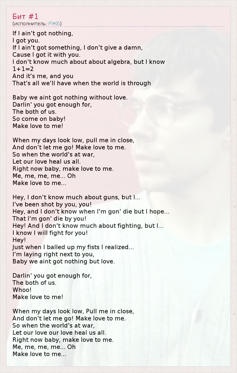 Если у меня ничего нет, У меня все равно есть ты. Если у меня ничего нет, то мне все равно, Ведь мы с тобой вместе. Я не сильна в алгебре, но я знаю: 1+1=2 И это ты и я, Это все, что будет у нас, когда не будет ничего в этом мире. Дорогой, у нас нет ничего, если нет любви. Дорогой, у тебя достаточно всего Для нас обоих. Вперед, малыш! Люби меня! Когда у меня неудачный день, обними меня И не отпускай! Люби меня! Когда на Земле война, Пусть наша любовь всех исцеляет! А сейчас, малыш, люби меня. Меня, меня, меня, меня...о! Люби меня... Эй, я не разбираюсь в оружии, но я... Ты подстрелил меня! Эй, я не знаю, когда умру, но я надеюсь... Что умру с тобой рядом! Эй! Я не разбираюсь в борьбе, но я... Я знаю, что буду бороться за тебя! Эй! Лишь только когда я сжала руки в кулаки, я поняла... Что принадлежу тебе*, Малыш, у нас нет ничего, кроме любви. Дорогой, у тебя достаточно всего Для нас обоих. Ууу! Люби меня! Когда у меня неудачный день, обними меня И не отпускай! Люби меня! Когда на Земле война, Пусть наша любовь всех исцеляет! А сейчас, малыш, люби меня. Меня, меня, меня, меня...о! Люби меня... * досл.: лежу с тобой рядом