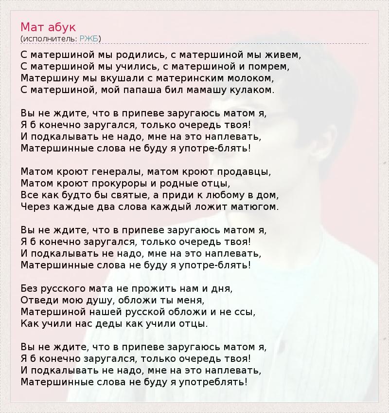 С матершиной мы родились, с матершиной мы живем, С матершиной мы учились, с матершиной и помрем, Матершину мы вкушали с материнским молоком, С матершиной, мой папаша бил мамашу кулаком. Вы не ждите, что в припеве заругаюсь матом я, Я б конечно заругался, только очередь твоя! И подкалывать не надо, мне на это наплевать, Матершинные слова не буду я употре-блять! Матом кроют генералы, матом кроют продавцы, Матом кроют прокуроры и родные отцы, Все как будто бы святые, а приди к любому в дом, Через каждые два слова каждый ложит матюгом. Вы не ждите, что в припеве заругаюсь матом я, Я б конечно заругался, только очередь твоя! И подкалывать не надо, мне на это наплевать, Матершинные слова не буду я употре-блять! Без русского мата не прожить нам и дня, Отведи мою душу, обложи ты меня, Матершиной нашей русской обложи и не ссы, Как учили нас деды как учили отцы. Вы не ждите, что в припеве заругаюсь матом я, Я б конечно заругался, только очередь твоя! И подкалывать не надо, мне на это наплевать, Матершинные слова не буду я употреблять!