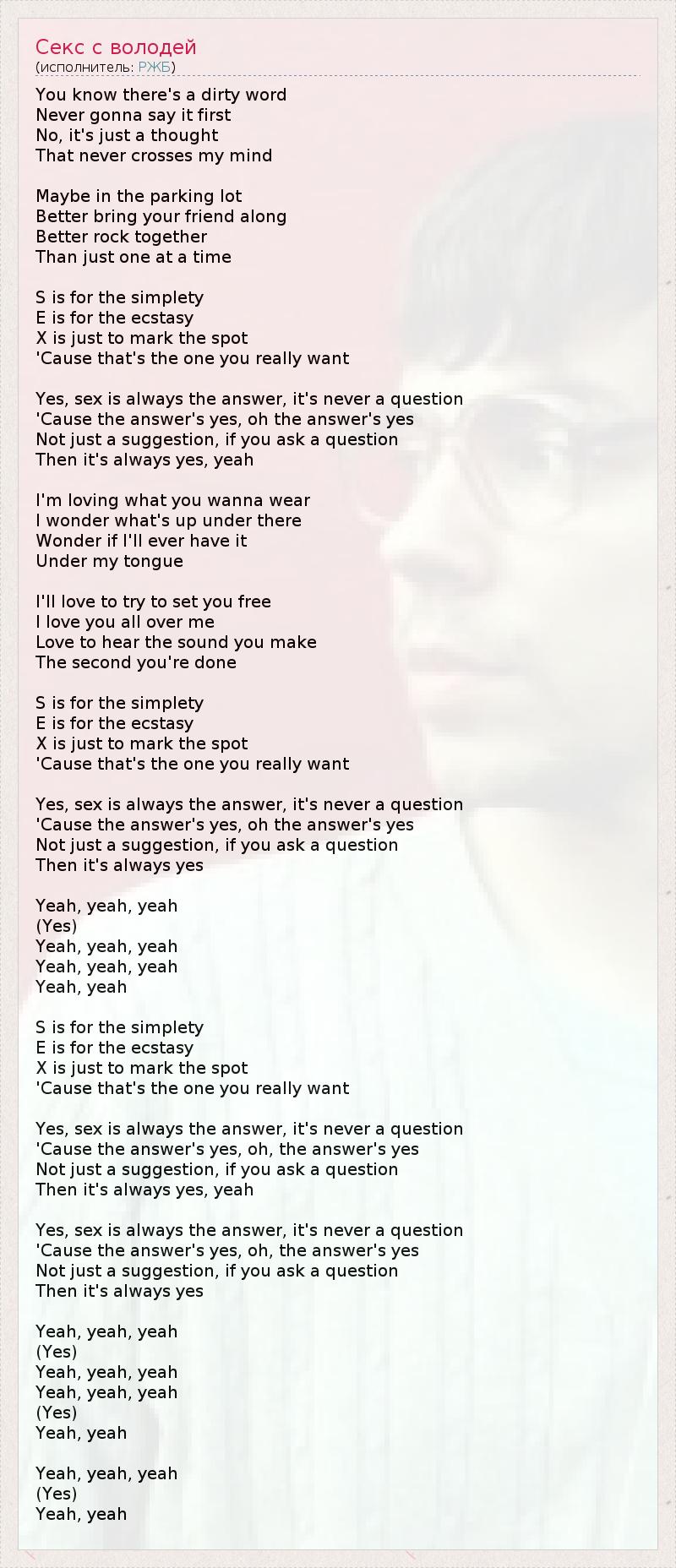 Ты же знаешь это пошлое слово, Ни за что не скажу его первым. Ничего особенного, это просто мысль, Которая никогда не приходила мне в голову. Может, где-нибудь на парковке Ты захватишь с собой свою подружку, И мы лучше встряхнемся все вместе, Чем просто один за другим... «S» - простота, «E» - экстаз, «X» - просто чтобы оставить след, Потому что это единственное, чего ты по-настоящему хочешь. Да, секс – это всегда ответ и никогда - вопрос, Потому что ответ – да, о, ответ - да. Это не просто предложение, если ты задаешь вопрос, Ответом всегда будет «да»! Я тащусь от той одежды, которую ты надеваешь, Мне сразу становится любопытно, что же там под ней. Интересно, смогу ли я пройтись по этому Своим языком? Мне бы очень хотелось попытаться выпустить тебя на свободу, Я обожаю, когда ты касаешься меня во всех местах. Люблю слушать звуки, которые ты издаёшь В ту секунду, когда кончаешь... «S» - простота, «E» - экстаз, «X» - просто чтобы оставить след, Потому что это единственное, чего ты по-настоящему хочешь. Да, секс – это всегда ответ и никогда - вопрос, Потому что ответ – да, о, ответ - да. Это не просто предложение, если ты задаешь вопрос, Ответом всегда будет «да»! Да, да, да (Да) Да, да, да Да, да, да Да, да «S» - простота, «E» - экстаз, «X» - просто чтобы оставить след, Потому что это единственное, чего ты по-настоящему хочешь. Да, секс – это всегда ответ и никогда - вопрос, Потому что ответ – да, о, ответ - да. Это не просто предложение, если ты задаешь вопрос, Ответом всегда будет «да»! Да, секс – это всегда ответ и никогда - вопрос, Потому что ответ – да, о, ответ - да. Это не просто предложение, если ты задаешь вопрос, Ответом всегда будет «да»! Да, да, да (Да) Да, да, да Да, да, да (Да) Да, да Да, да, да (Да) Да, да