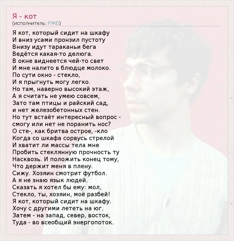 Я кот, который сидит на шкафу И вниз усами пронзил пустоту Внизу идут тараканьи бега Ведётся какая-то делюга. В окне виднеется чей-то свет И мне налито в блюдце молоко. По сути окно - стекло, И я прыгнуть могу легко. Но там, наверно высокий этаж, А я считать не умею совсем, Зато там птицы и райский сад, и нет железобетонных стен. Но тут встаёт интересный вопрос - смогу или нет не поранить нос? О сте-, как бритва острое, -кло Когда со шкафа сорвусь стрелой И хватит ли массы тела мне Пробить стеклянную прочность ту Насквозь. И положить конец тому, Что держит меня в плену. Сижу. Хозяин смотрит футбол. А я не знаю язык людей. Сказать я хотел бы ему: мол, Стекло, ты, хозяин, моё разбей! Я кот, который сидит на шкафу. Хочу с другими лететь на юг. Затем - на запад, север, восток, Туда - во всеобщий энергопоток.