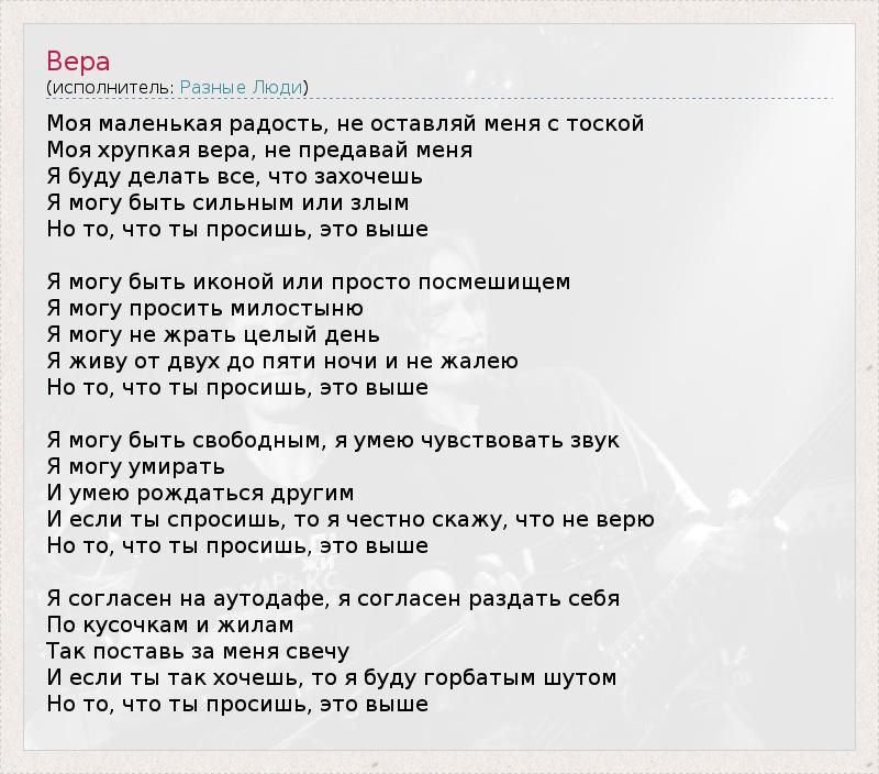 Моя маленькая радость, не оставляй меня с тоской Моя хрупкая вера, не предавай меня Я буду делать все, что захочешь Я могу быть сильным или злым Но то, что ты просишь, это выше Я могу быть иконой или просто посмешищем Я могу просить милостыню Я могу не жрать целый день Я живу от двух до пяти ночи и не жалею Но то, что ты просишь, это выше Я могу быть свободным, я умею чувствовать звук Я могу умирать И умею рождаться другим И если ты спросишь, то я честно скажу, что не верю Но то, что ты просишь, это выше Я согласен на аутодафе, я согласен раздать себя По кусочкам и жилам Так поставь за меня свечу И если ты так хочешь, то я буду горбатым шутом Но то, что ты просишь, это выше