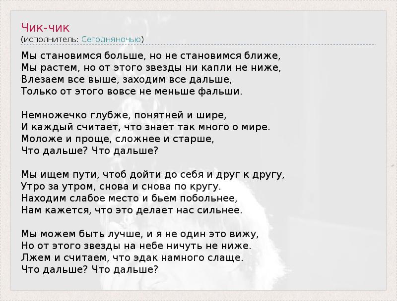 А как ты думаешь, о чем песня "Чик-чик" ?