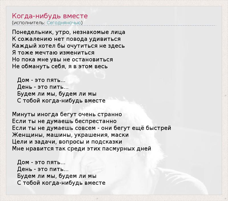 Понедельник, утро, незнакомые лица К сожалению нет повода удивиться Каждый хотел бы очутиться не здесь Я тоже мечтаю измениться Но пока мне увы не остановиться Не обмануть себя, я в этом весь Дом - это пять... День - это пить... Будем ли мы, будем ли мы С тобой когда-нибудь вместе Минуты иногда бегут очень странно Если ты не думаешь беспрестанно Если ты не думаешь совсем - они бегут ещё быстрей Женщины, машины, украшения, маски Цели и задачи, вопросы и подсказки Мне нравится так среди этих пасмурных дней Дом - это пять... День - это пить... Будем ли мы, будем ли мы С тобой когда-нибудь вместе