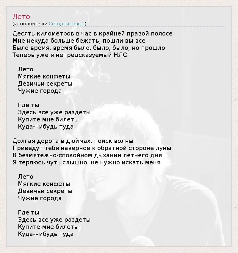 Десять километров в час в крайней правой полосе Мне некуда больше бежать, пошли вы все Было время, время было, было, было, но прошло Теперь уже я непредсказуемый НЛО Лето Мягкие конфеты Девичьи секреты Чужие города Где ты Здесь все уже раздеты Купите мне билеты Куда-нибудь туда Долгая дорога в дюймах, поиск волны Приведут тебя наверное к обратной стороне луны В безмятежно-спокойном дыхании летнего дня Я теряюсь чуть слышно, не нужно искать меня Лето Мягкие конфеты Девичьи секреты Чужие города Где ты Здесь все уже раздеты Купите мне билеты Куда-нибудь туда