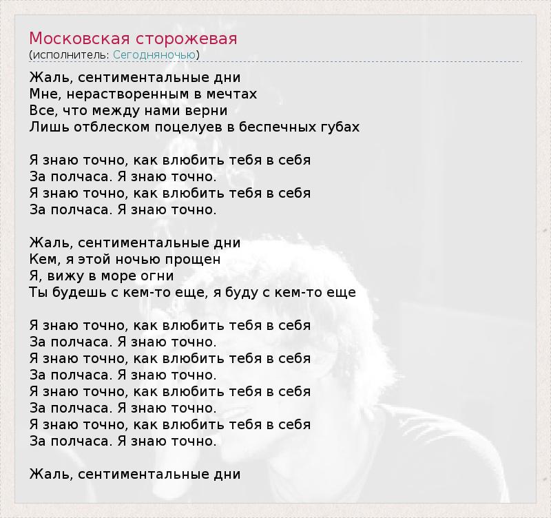 Жаль, сентиментальные дни Мне, нерастворенным в мечтах Все, что между нами верни Лишь отблеском поцелуев в беспечных губах Я знаю точно, как влюбить тебя в себя За полчаса. Я знаю точно. Я знаю точно, как влюбить тебя в себя За полчаса. Я знаю точно. Жаль, сентиментальные дни Кем, я этой ночью прощен Я, вижу в море огни Ты будешь с кем-то еще, я буду с кем-то еще Я знаю точно, как влюбить тебя в себя За полчаса. Я знаю точно. Я знаю точно, как влюбить тебя в себя За полчаса. Я знаю точно. Я знаю точно, как влюбить тебя в себя За полчаса. Я знаю точно. Я знаю точно, как влюбить тебя в себя За полчаса. Я знаю точно. Жаль, сентиментальные дни
