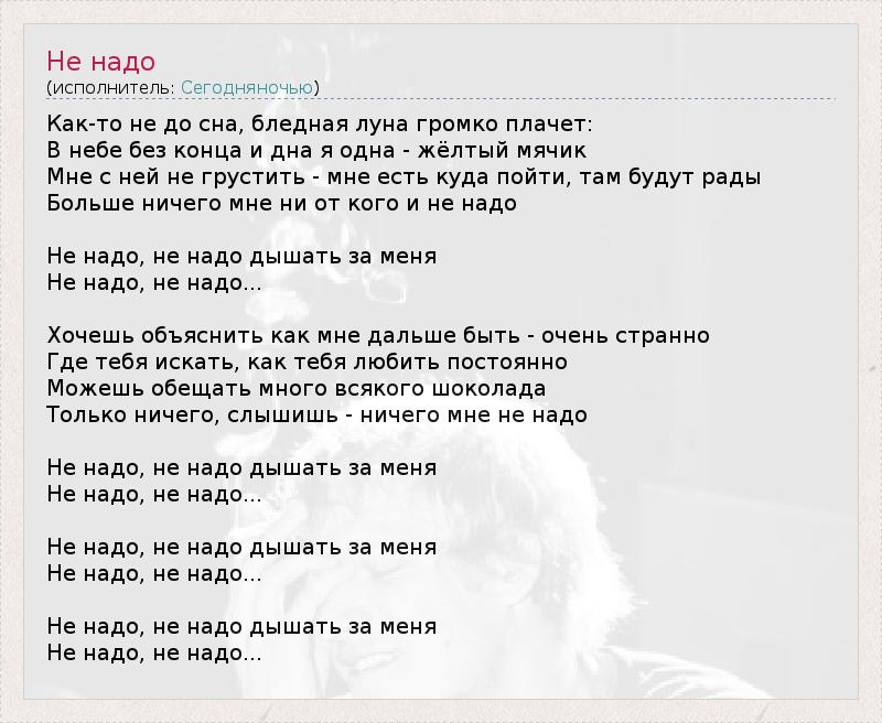 Как-то не до сна, бледная луна громко плачет: В небе без конца и дна я одна - жёлтый мячик Мне с ней не грустить - мне есть куда пойти, там будут рады Больше ничего мне ни от кого и не надо Не надо, не надо дышать за меня Не надо, не надо... Хочешь объяснить как мне дальше быть - очень странно Где тебя искать, как тебя любить постоянно Можешь обещать много всякого шоколада Только ничего, слышишь - ничего мне не надо Не надо, не надо дышать за меня Не надо, не надо... Не надо, не надо дышать за меня Не надо, не надо... Не надо, не надо дышать за меня Не надо, не надо...