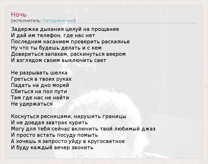 Это интересно:Это некорректное название группы «Сегодняночью». Если текущий исполнитель появляется в твоих чартах, сделай себе и Last.fm пользу. Исправь теги в своих аудиофайлах.«Сегодня ночью» это: Никита Козлов — вокал, гитара, губная гармошка Алексей Ульрих — клавишные, бас Александр Корбуков —... продолжение