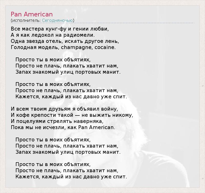 Все мастера кунг-фу и гении любви, А я как ледокол на радиомели. Одна звезда отель, искать другое лень, Голодная модель, champagne, cocaine. Просто ты в моих объятиях, Просто не плачь, плакать хватит нам, Запах знакомый улиц портовых манит. Просто ты в моих объятиях, Просто не плачь, плакать хватит нам, Кажется, каждый из нас давно уже спит. И всем твоим друзьям я объявил войну, И кофе крепости такой — не выжить никому, И поцелуями стрелять наверняка, Пока мы не исчезли, как Pan American. Просто ты в моих объятиях, Просто не плачь, плакать хватит нам, Запах знакомый улиц портовых манит. Просто ты в моих объятиях, Просто не плачь, плакать хватит нам, Кажется, каждый из нас давно уже спит.