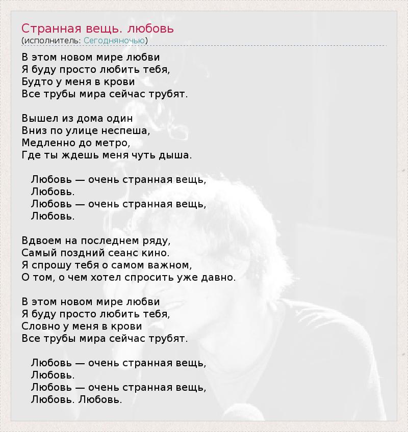 В этом новом мире любви Я буду просто любить тебя, Будто у меня в крови Все трубы мира сейчас трубят. Вышел из дома один Вниз по улице неспеша, Медленно до метро, Где ты ждешь меня чуть дыша. Любовь — очень странная вещь, Любовь. Любовь — очень странная вещь, Любовь. Вдвоем на последнем ряду, Самый поздний сеанс кино. Я спрошу тебя о самом важном, О том, о чем хотел спросить уже давно. В этом новом мире любви Я буду просто любить тебя, Словно у меня в крови Все трубы мира сейчас трубят. Любовь — очень странная вещь, Любовь. Любовь — очень странная вещь, Любовь. Любовь.