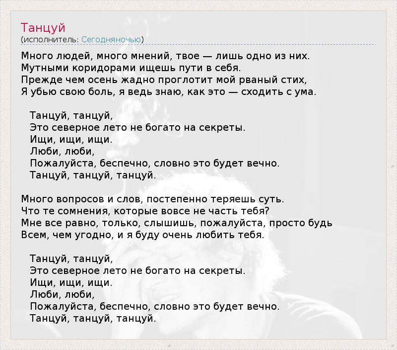 Много людей, много мнений, твое — лишь одно из них. Мутными коридорами ищешь пути в себя. Прежде чем осень жадно проглотит мой рваный стих, Я убью свою боль, я ведь знаю, как это — сходить с ума. Танцуй, танцуй, Это северное лето не богато на секреты. Ищи, ищи, ищи. Люби, люби, Пожалуйста, беспечно, словно это будет вечно. Танцуй, танцуй, танцуй. Много вопросов и слов, постепенно теряешь суть. Что те сомнения, которые вовсе не часть тебя? Мне все равно, только, слышишь, пожалуйста, просто будь Всем, чем угодно, и я буду очень любить тебя. Танцуй, танцуй, Это северное лето не богато на секреты. Ищи, ищи, ищи. Люби, люби, Пожалуйста, беспечно, словно это будет вечно. Танцуй, танцуй, танцуй.