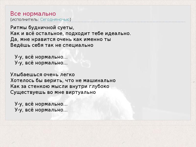 Это интересно:Это некорректное название группы «Сегодняночью». Если текущий исполнитель появляется в твоих чартах, сделай себе и Last.fm пользу. Исправь теги в своих аудиофайлах.«Сегодня ночью» это: Никита Козлов — вокал, гитара, губная гармошка Алексей Ульрих — клавишные, бас Александр Корбуков —... продолжение