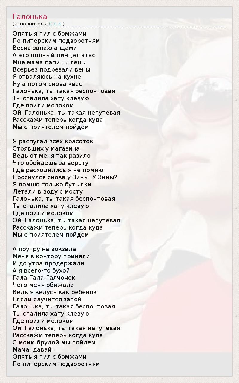Опять я пил с бомжами По питерским подворотням Весна запахла щами А это полный пинцет атас Мне мама папины гены Всерьез подрезали вены Я отваляюсь на кухне Ну а потом снова квас Галонька, ты такая беспонтовая Ты спалила хату клевую Где поили молоком Ой, Галонька, ты такая непутевая Расскажи теперь когда куда Мы с приятелем пойдем Я распугал всех красоток Стоявших у магазина Ведь от меня так разило Что обойдешь за версту Где расходились я не помню Проснулся снова у Зины. У Зины? Я помню только бутылки Летали в воду с мосту Галонька, ты такая беспонтовая Ты спалила хату клевую Где поили молоком Ой, Галонька, ты такая непутевая Расскажи теперь когда куда Мы с приятелем пойдем А поутру на вокзале Меня в контору приняли И до утра продержали А я всего-то бухой Гала-Гала-Галчонок Чего меня обижала Ведь я ведусь как ребенок Гляди случится запой Галонька, ты такая беспонтовая Ты спалила хату клевую Где поили молоком Ой, Галонька, ты такая непутевая Расскажи теперь когда куда С моим брудой мы пойдем Мама, давай! Опять я пил с бомжами По питерским подворотням