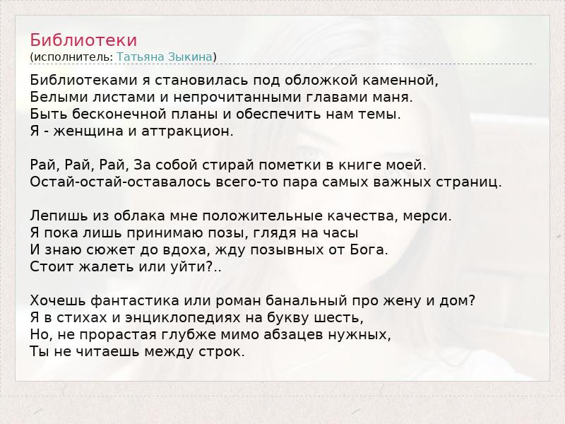 Библиотеками я становилась под обложкой каменной, Белыми листами и непрочитанными главами маня. Быть бесконечной планы и обеспечить нам темы. Я - женщина и аттракцион. Рай, Рай, Рай, За собой стирай пометки в книге моей. Остай-остай-оставалось всего-то пара самых важных страниц. Лепишь из облака мне положительные качества, мерси. Я пока лишь принимаю позы, глядя на часы И знаю сюжет до вдоха, жду позывных от Бога. Стоит жалеть или уйти?.. Хочешь фантастика или роман банальный про жену и дом? Я в стихах и энциклопедиях на букву шесть, Но, не прорастая глубже мимо абзацев нужных, Ты не читаешь между строк.