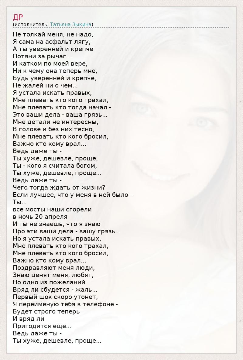 Не толкай меня, не надо, Я сама на асфальт лягу, А ты уверенней и крепче Потяни за рычаг... И катком по моей вере, Ни к чему она теперь мне, Будь уверенней и крепче, Не жалей ни о чем... Я устала искать правых, Мне плевать кто кого трахал, Мне плевать кто тогда начал - Это ваши дела - ваша грязь... Мне детали не интересны, В голове и без них тесно, Мне плевать кто кого бросил, Важно кто кому врал... Ведь даже ты - Ты хуже, дешевле, проще, Ты - кого я считала богом, Ты хуже, дешевле, проще... Ведь даже ты - Чего тогда ждать от жизни? Если лучшее, что у меня в ней было - Ты... все мосты наши сгорели в ночь 20 апреля И ты не знаешь, что я знаю Про эти ваши дела - вашу грязь... Но я устала искать правых, Мне плевать кто кого трахал, Мне плевать кто кого бросил, Важно кто кому врал... Поздравляют меня люди, Знаю ценят меня, любят, Но одно из пожеланий Вряд ли сбудется - жаль... Первый шок скоро утонет, Я переименую тебя в телефоне - Будет строго теперь И вряд ли Пригодится еще... Ведь даже ты - Ты хуже, дешевле, проще...