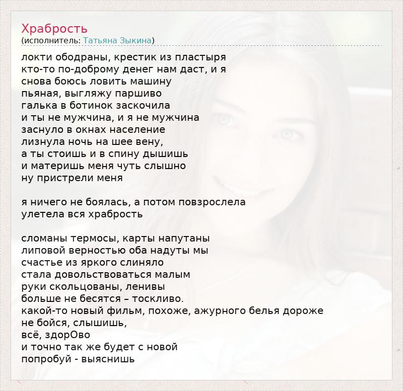 Это интересно:Татьяна Зыкина родилась в Ижевске 20 апреля 1981 году. Работала журналистом, теле- и радио-ведущей. Песни начала сочинять в... продолжение