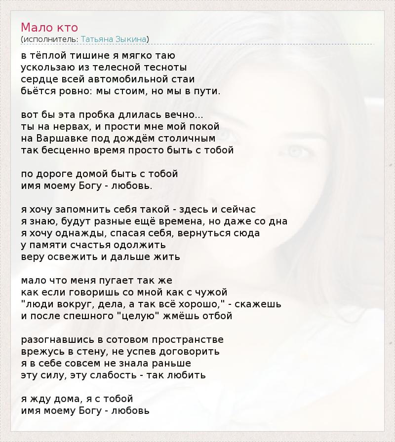 Это интересно:Татьяна Зыкина родилась в Ижевске 20 апреля 1981 году. Работала журналистом, теле- и радио-ведущей. Песни начала сочинять в... продолжение