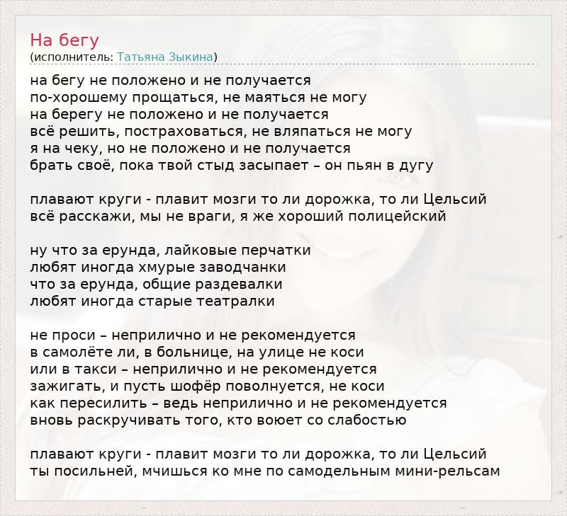 на бегу не положено и не получается по-хорошему прощаться, не маяться не могу на берегу не положено и не получается всё решить, постраховаться, не вляпаться не могу я на чеку, но не положено и не получается брать своё, пока твой стыд засыпает – он пьян в дугу плавают круги - плавит мозги то ли дорожка, то ли Цельсий всё расскажи, мы не враги, я же хороший полицейский ну что за ерунда, лайковые перчатки любят иногда хмурые заводчанки что за ерунда, общие раздевалки любят иногда старые театралки не проси – неприлично и не рекомендуется в самолёте ли, в больнице, на улице не коси или в такси – неприлично и не рекомендуется зажигать, и пусть шофёр поволнуется, не коси как пересилить – ведь неприлично и не рекомендуется вновь раскручивать того, кто воюет со слабостью плавают круги - плавит мозги то ли дорожка, то ли Цельсий ты посильней, мчишься ко мне по самодельным мини-рельсам
