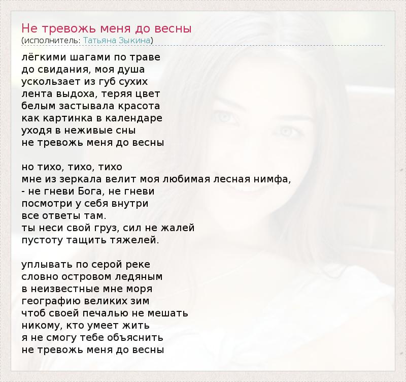 лёгкими шагами по траве до свидания, моя душа ускользает из губ сухих лента выдоха, теряя цвет белым застывала красота как картинка в календаре уходя в неживые сны не тревожь меня до весны но тихо, тихо, тихо мне из зеркала велит моя любимая лесная нимфа, - не гневи Бога, не гневи посмотри у себя внутри все ответы там. ты неси свой груз, сил не жалей пустоту тащить тяжелей. уплывать по серой реке словно островом ледяным в неизвестные мне моря географию великих зим чтоб своей печалью не мешать никому, кто умеет жить я не смогу тебе объяснить не тревожь меня до весны