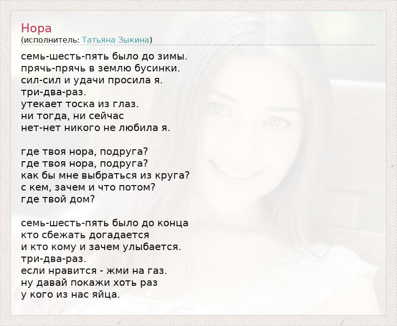 семь-шесть-пять было до зимы. прячь-прячь в землю бусинки. сил-сил и удачи просила я. три-два-раз. утекает тоска из глаз. ни тогда, ни сейчас нет-нет никого не любила я. где твоя нора, подруга? где твоя нора, подруга? как бы мне выбраться из круга? с кем, зачем и что потом? где твой дом? семь-шесть-пять было до конца кто сбежать догадается и кто кому и зачем улыбается. три-два-раз. если нравится - жми на газ. ну давай покажи хоть раз у кого из нас яйца.