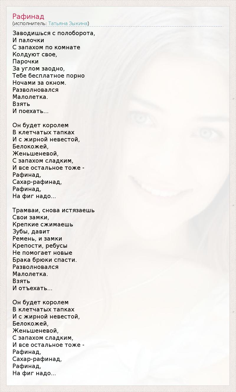 Это интересно:Татьяна Зыкина родилась в Ижевске 20 апреля 1981 году. Работала журналистом, теле- и радио-ведущей. Песни начала сочинять в... продолжение