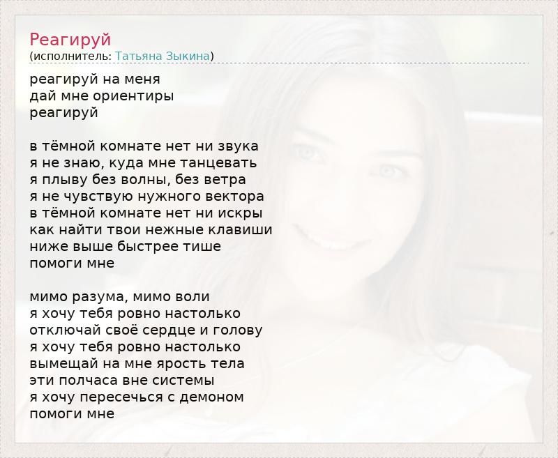 реагируй на меня дай мне ориентиры реагируй в тёмной комнате нет ни звука я не знаю, куда мне танцевать я плыву без волны, без ветра я не чувствую нужного вектора в тёмной комнате нет ни искры как найти твои нежные клавиши ниже выше быстрее тише помоги мне мимо разума, мимо воли я хочу тебя ровно настолько отключай своё сердце и голову я хочу тебя ровно настолько вымещай на мне ярость тела эти полчаса вне системы я хочу пересечься с демоном помоги мне