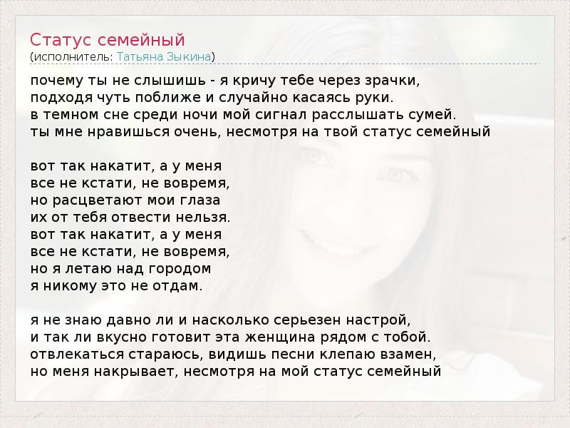 почему ты не слышишь - я кричу тебе через зрачки, подходя чуть поближе и случайно касаясь руки. в темном сне среди ночи мой сигнал расслышать сумей. ты мне нравишься очень, несмотря на твой статус семейный вот так накатит, а у меня все не кстати, не вовремя, но расцветают мои глаза их от тебя отвести нельзя. вот так накатит, а у меня все не кстати, не вовремя, но я летаю над городом я никому это не отдам. я не знаю давно ли и насколько серьезен настрой, и так ли вкусно готовит эта женщина рядом с тобой. отвлекаться стараюсь, видишь песни клепаю взамен, но меня накрывает, несмотря на мой статус семейный