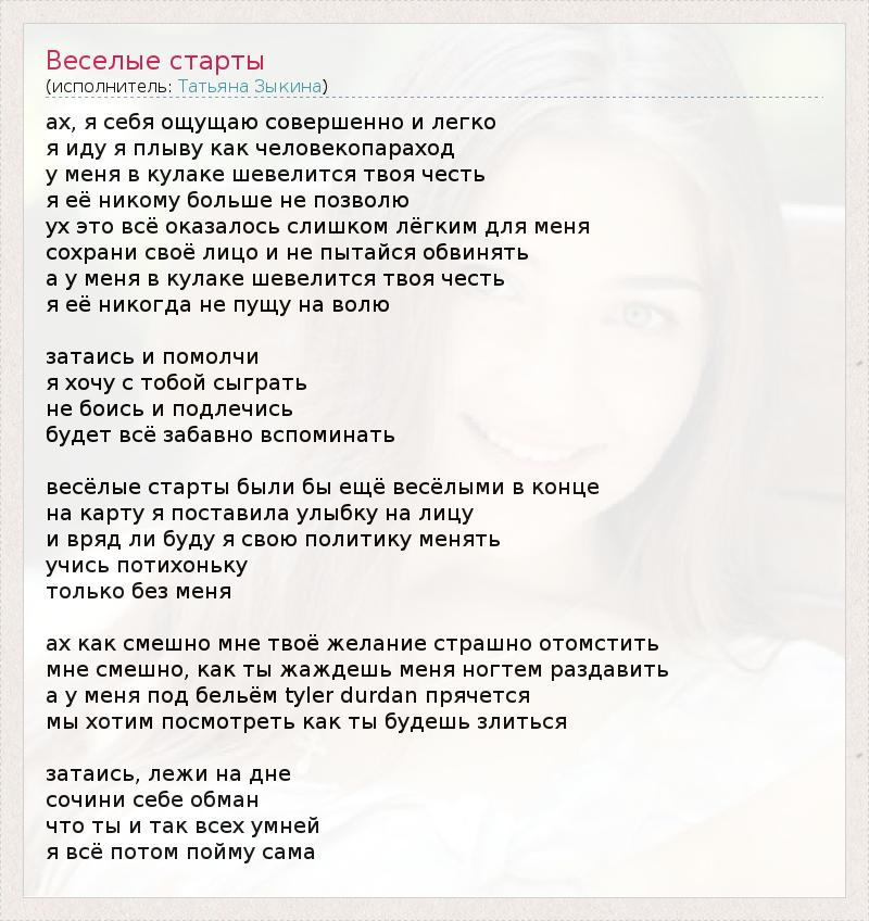 Это интересно:Татьяна Зыкина родилась в Ижевске 20 апреля 1981 году. Работала журналистом, теле- и радио-ведущей. Песни начала сочинять в... продолжение