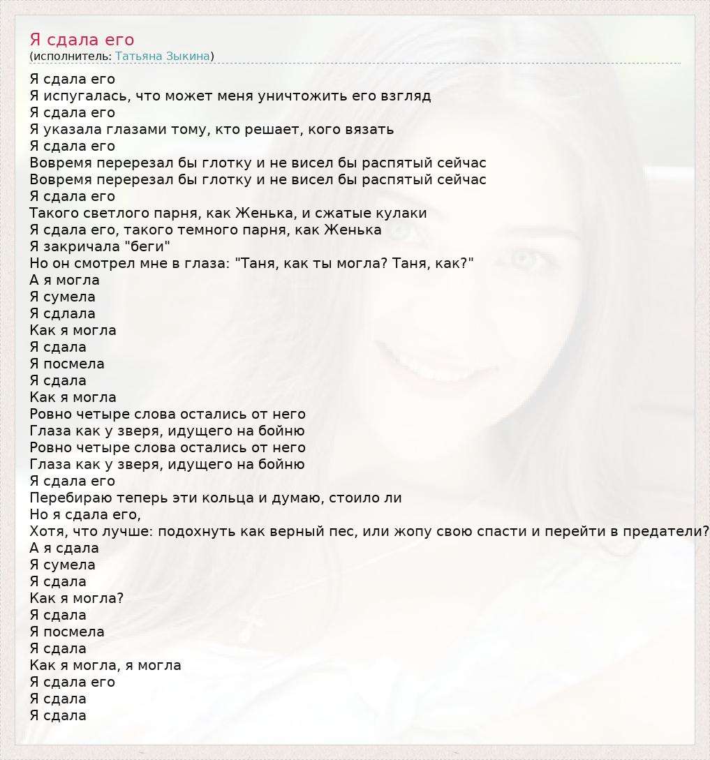 Я сдала его Я испугалась, что может меня уничтожить его взгляд Я сдала его Я указала глазами тому, кто решает, кого вязать Я сдала его Вовремя перерезал бы глотку и не висел бы распятый сейчас Вовремя перерезал бы глотку и не висел бы распятый сейчас Я сдала его Такого светлого парня, как Женька, и сжатые кулаки Я сдала его, такого темного парня, как Женька Я закричала "беги" Но он смотрел мне в глаза: "Таня, как ты могла? Таня, как?" А я могла Я сумела Я сдлала Как я могла Я сдала Я посмела Я сдала Как я могла Ровно четыре слова остались от него Глаза как у зверя, идущего на бойню Ровно четыре слова остались от него Глаза как у зверя, идущего на бойню Я сдала его Перебираю теперь эти кольца и думаю, стоило ли Но я сдала его, Хотя, что лучше: подохнуть как верный пес, или жопу свою спасти и перейти в предатели? А я сдала Я сумела Я сдала Как я могла? Я сдала Я посмела Я сдала Как я могла, я могла Я сдала его Я сдала Я сдала