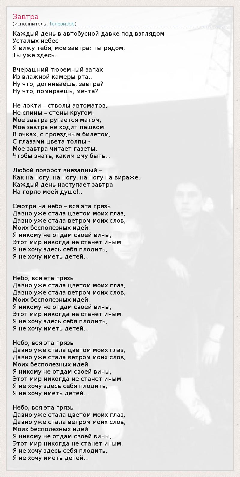 Это интересно:Группа "Телевизор" образовалась в Ленинграде в 1984 году на обломках арт-роковой группы "Озеро" и дебютировала сразу на 2 фестивале Ленинградского Рок-клуба 1984 года, войдя в число лауреатов, причем лидер группы, студент английского отделения филфака Ленинградского ГосУниверситета Михаил Борзыкин был отдельно отмечен как автор лучших текстов. Столь же успешно выступил "Телевизор"... продолжение