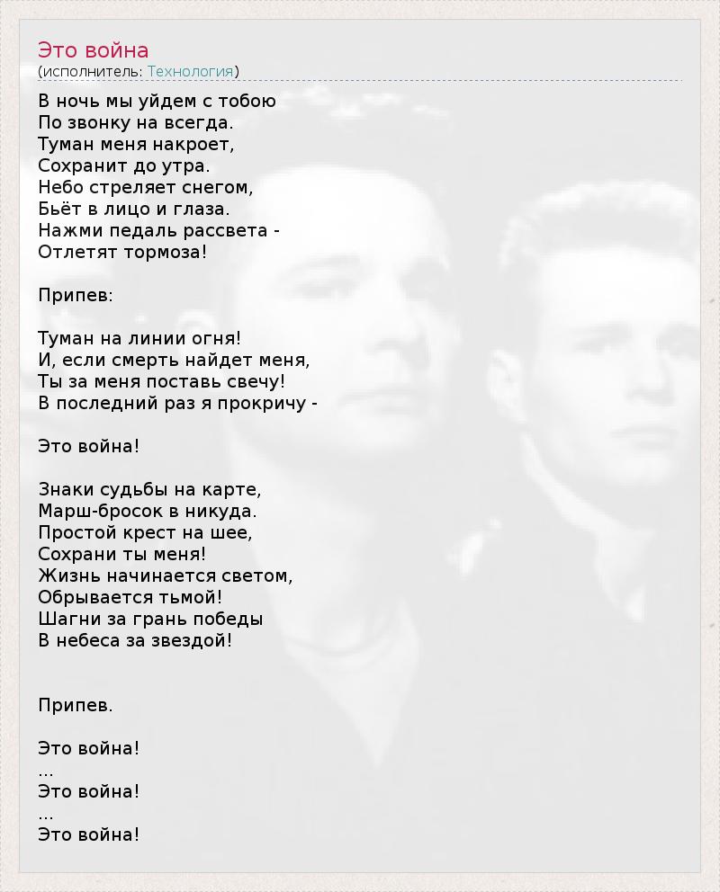 В ночь мы уйдем с тобою По звонку на всегда. Туман меня накроет, Сохранит до утра. Небо стреляет снегом, Бьёт в лицо и глаза. Нажми педаль рассвета - Отлетят тормоза! Припев: Туман на линии огня! И, если смерть найдет меня, Ты за меня поставь свечу! В последний раз я прокричу - Это война! Знаки судьбы на карте, Марш-бросок в никуда. Простой крест на шее, Сохрани ты меня! Жизнь начинается светом, Обрывается тьмой! Шагни за грань победы В небеса за звездой! Припев. Это война! ... Это война! ... Это война!