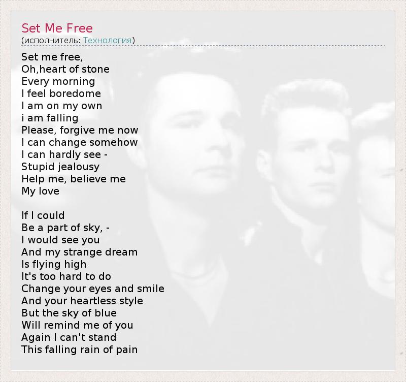 Set me free, Oh,heart of stone Every morning I feel boredome I am on my own i am falling Please, forgive me now I can change somehow I can hardly see - Stupid jealousy Help me, believe me My love If I could Be a part of sky, - I would see you And my strange dream Is flying high It's too hard to do Change your eyes and smile And your heartless style But the sky of blue Will remind me of you Again I can't stand This falling rain of pain