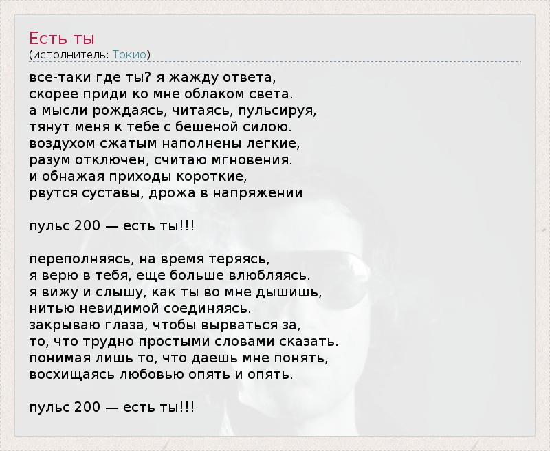 все-таки где ты? я жажду ответа, скорее приди ко мне облаком света. а мысли рождаясь, читаясь, пульсируя, тянут меня к тебе с бешеной силою. воздухом сжатым наполнены легкие, разум отключен, считаю мгновения. и обнажая приходы короткие, рвутся суставы, дрожа в напряжении пульс 200 — есть ты!!! переполняясь, на время теряясь, я верю в тебя, еще больше влюбляясь. я вижу и слышу, как ты во мне дышишь, нитью невидимой соединяясь. закрываю глаза, чтобы вырваться за, то, что трудно простыми словами сказать. понимая лишь то, что даешь мне понять, восхищаясь любовью опять и опять. пульс 200 — есть ты!!!