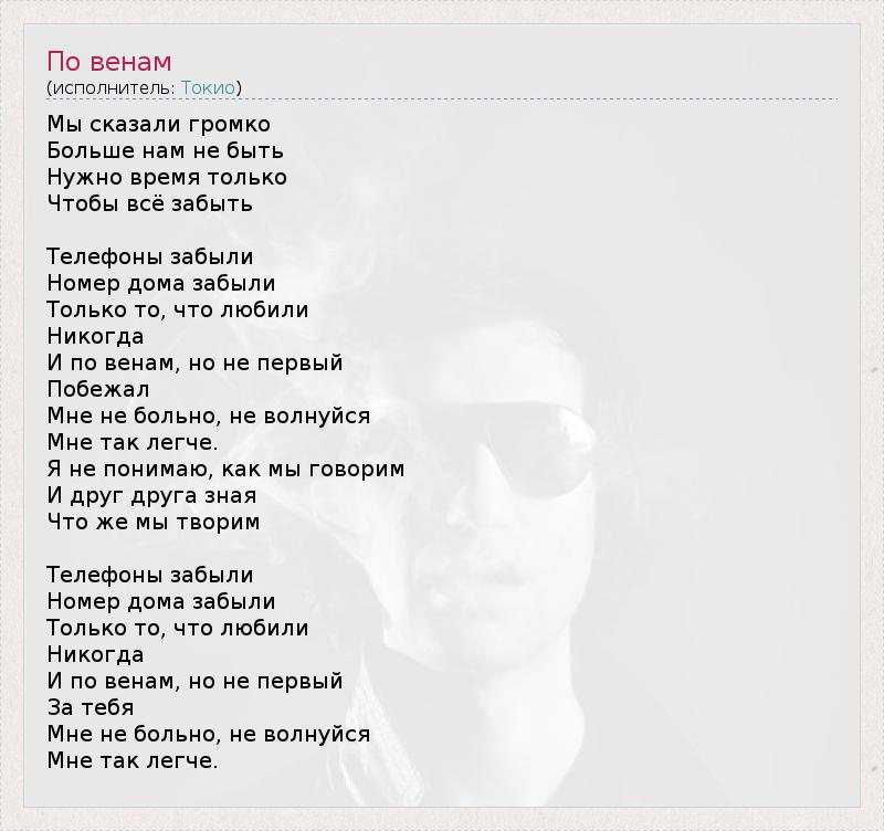 Мы сказали громко Больше нам не быть Нужно время только Чтобы всё забыть Телефоны забыли Номер дома забыли Только то, что любили Никогда И по венам, но не первый Побежал Мне не больно, не волнуйся Мне так легче. Я не понимаю, как мы говорим И друг друга зная Что же мы творим Телефоны забыли Номер дома забыли Только то, что любили Никогда И по венам, но не первый За тебя Мне не больно, не волнуйся Мне так легче.