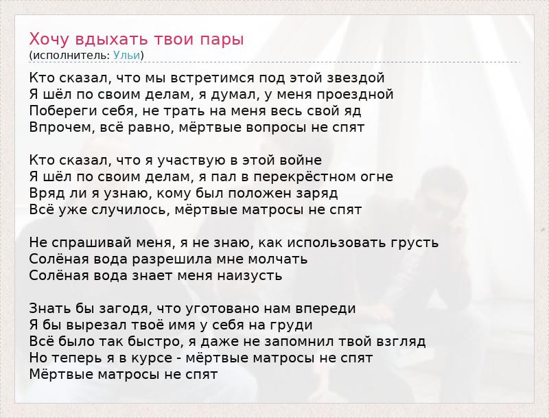 Кто сказал, что мы встретимся под этой звездой Я шёл по своим делам, я думал, у меня проездной Побереги себя, не трать на меня весь свой яд Впрочем, всё равно, мёртвые вопросы не спят Кто сказал, что я участвую в этой войне Я шёл по своим делам, я пал в перекрёстном огне Вряд ли я узнаю, кому был положен заряд Всё уже случилось, мёртвые матросы не спят Не спрашивай меня, я не знаю, как использовать грусть Солёная вода разрешила мне молчать Солёная вода знает меня наизусть Знать бы загодя, что уготовано нам впереди Я бы вырезал твоё имя у себя на груди Всё было так быстро, я даже не запомнил твой взгляд Но теперь я в курсе - мёртвые матросы не спят Мёртвые матросы не спят