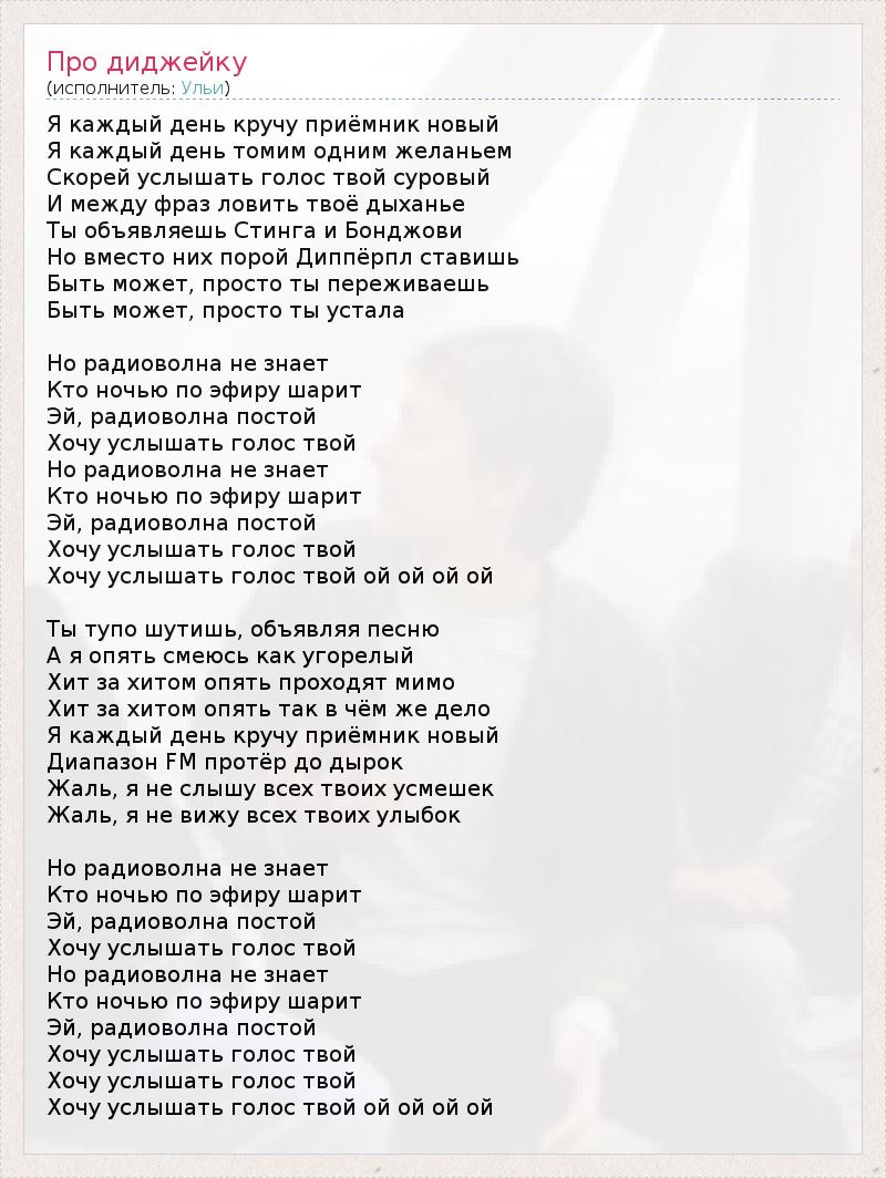 Я каждый день кручу приёмник новый Я каждый день томим одним желаньем Скорей услышать голос твой суровый И между фраз ловить твоё дыханье Ты объявляешь Стинга и Бонджови Но вместо них порой Диппёрпл ставишь Быть может, просто ты переживаешь Быть может, просто ты устала Но радиоволна не знает Кто ночью по эфиру шарит Эй, радиоволна постой Хочу услышать голос твой Но радиоволна не знает Кто ночью по эфиру шарит Эй, радиоволна постой Хочу услышать голос твой Хочу услышать голос твой ой ой ой ой Ты тупо шутишь, объявляя песню А я опять смеюсь как угорелый Хит за хитом опять проходят мимо Хит за хитом опять так в чём же дело Я каждый день кручу приёмник новый Диапазон FM протёр до дырок Жаль, я не слышу всех твоих усмешек Жаль, я не вижу всех твоих улыбок Но радиоволна не знает Кто ночью по эфиру шарит Эй, радиоволна постой Хочу услышать голос твой Но радиоволна не знает Кто ночью по эфиру шарит Эй, радиоволна постой Хочу услышать голос твой Хочу услышать голос твой Хочу услышать голос твой ой ой ой ой