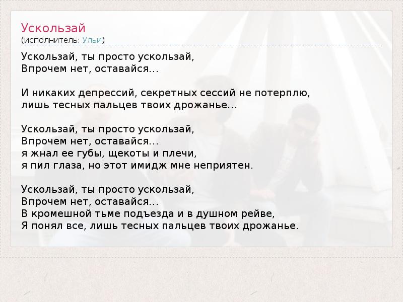 А как ты думаешь, о чем песня "Ускользай" ?
