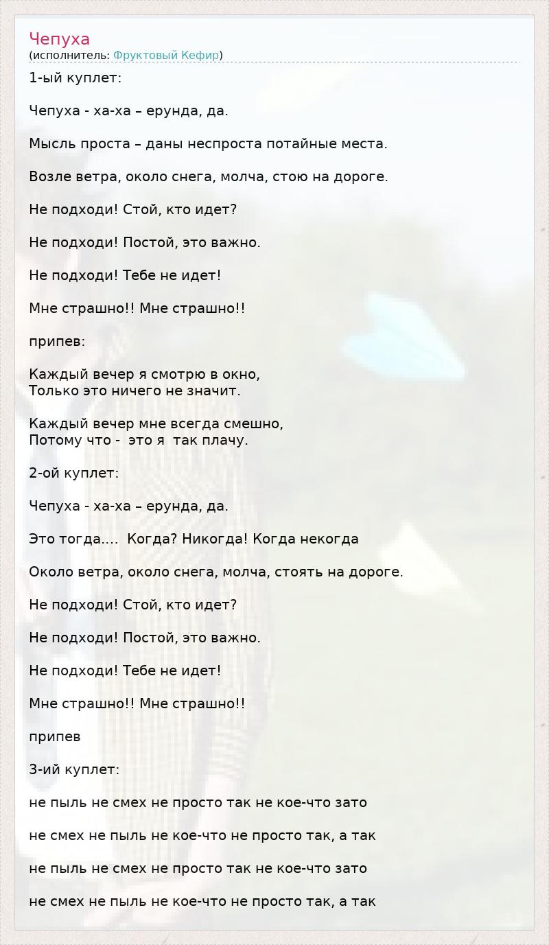 Это интересно:Ф Р У К Т О В Ы Й К Е Ф И Р - вокально-инструментальный коктейль, изготовленный по оригинальным рецептам. Обладает изысканной вкусовой гаммой. Употребив этот напиток, вы поймете, что всё в этом мире относительно. Что выход - это очередной вход, а конец - это только начало;с о с т а в: вокал, гитара, бас, барабаны, саксофон;п и щ е в а я ц е н н о с т ь: фанки-панк, поп-авангард, инди-рок; у п... продолжение