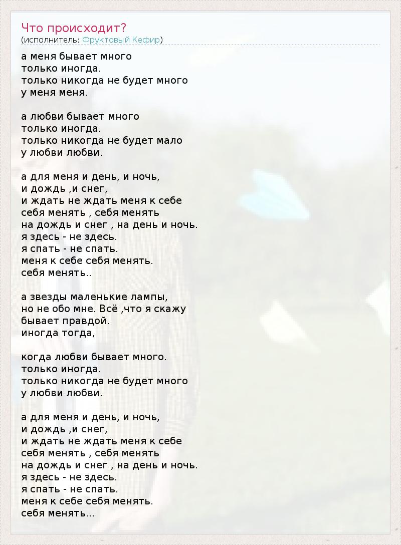 а меня бывает много только иногда. только никогда не будет много у меня меня. а любви бывает много только иногда. только никогда не будет мало у любви любви. а для меня и день, и ночь, и дождь ,и снег, и ждать не ждать меня к себе себя менять , себя менять на дождь и снег , на день и ночь. я здесь - не здесь. я спать - не спать. меня к себе себя менять. себя менять.. а звезды маленькие лампы, но не обо мне. Всё ,что я скажу бывает правдой. иногда тогда, когда любви бывает много. только иногда. только никогда не будет много у любви любви. а для меня и день, и ночь, и дождь ,и снег, и ждать не ждать меня к себе себя менять , себя менять на дождь и снег , на день и ночь. я здесь - не здесь. я спать - не спать. меня к себе себя менять. себя менять...