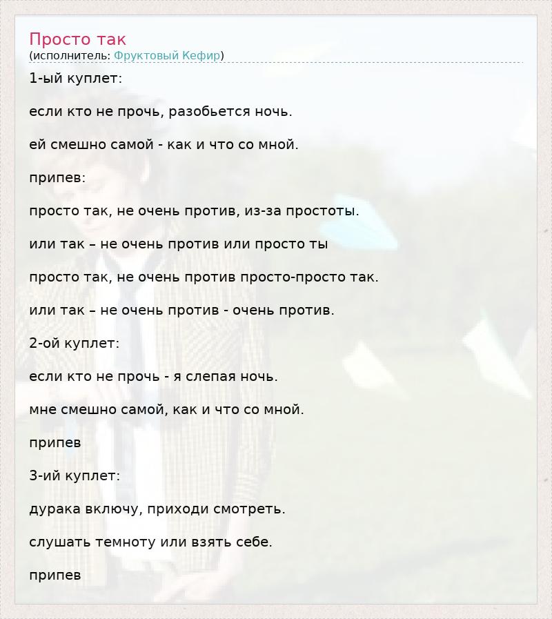 1-ый куплет: если кто не прочь, разобьется ночь. ей смешно самой - как и что со мной. припев: просто так, не очень против, из-за простоты. или так – не очень против или просто ты просто так, не очень против просто-просто так. или так – не очень против - очень против. 2-ой куплет: если кто не прочь - я слепая ночь. мне смешно самой, как и что со мной. припев 3-ий куплет: дурака включу, приходи смотреть. слушать темноту или взять себе. припев