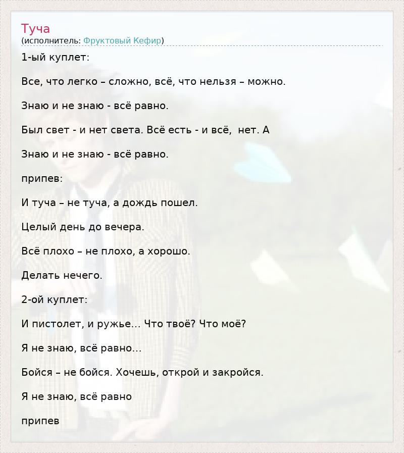 Это интересно:Ф Р У К Т О В Ы Й К Е Ф И Р - вокально-инструментальный коктейль, изготовленный по оригинальным рецептам. Обладает изысканной вкусовой гаммой. Употребив этот напиток, вы поймете, что всё в этом мире относительно. Что выход - это очередной вход, а конец - это только начало;с о с т а в: вокал, гитара, бас, барабаны, саксофон;п и щ е в а я ц е н н о с т ь: фанки-панк, поп-авангард, инди-рок; у п... продолжение