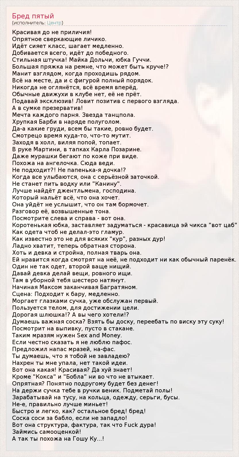 Красивая до не приличия! Опрятное сверкающие личико. Идёт сияет класс, шагает медленно. Добивается всего, идёт до победного. Стильная штучка! Майка Дольчи, юбка Гуччи. Большая пряжка на ремне, что может быть круче!? Манит взглядом, когда проходишь рядом. Всё на месте, да и с фигурой полный порядок. Никогда не оглянётся, всё время вперёд. Обычные движухи в клубе нет, её не прёт. Подавай эксклюзив! Ловит позитив с первого взгляда. А в сумке презерватив! Мечта каждого парня. Звезда танцпола. Хрупкая Барби в наряде полуголом. Да-а какие груди, всем бы такие, ровно будет. Смотрецо время куда-то, что-то мутит. Заходя в холл, виляя попой, топает. В руке Мартини, в тапках Карла Позарине. Даже мурашки бегают по коже при виде. Похожа на ангелочка. Сюда веди. Не подходит?! Не папенька-я дочка!? Когда все улыбаются, она с серьёзной заточкой. Не станет пить водку или "Канину". Лучше найдёт джентльмена, господина. Который нальёт всё, что она хочет. Она уйдёт не услышит, что он там бормочет. Разговор её, возвышенные тона. Посмотрите слева и справа - вот она. Коротенькая юбка, заставляет задуматься - красавица эй чикса "вот цаб" Как одета чтоб не делал-это гламур. Как известно это не для всяких "кур", разных дур! Ладно хватит, теперь обратная сторона. Хоть и девка и стройна, полная тварь она. Ей нравится когда смотрят на неё, не подходит ни как обычный паренёк. Один не так одет, второй ваще нищий. Давай девка делай вещи, ровного ищи. Там в уборной тебя шестеро натянут. Начиная Максом заканчивая Багратяном. Сцена: Подходит к бару, медленно. Моргает глазками сучка, уже обслужан первый. Пользуется телом, для достижении цели. Дорогая шлюшка!? А вы чего хотели!? Думаешь важная соска? Взять бы доску, переебать по виску эту суку! Посмотрит на выпивку, пусто в стакане. Таким мразям нужен Sex and Money. Если честно сказать я не люблю пафос. Предложил напас мразей, на-фас. Ты думаешь, что я тобой не завладею? Нахрен ты мне упала, нет такой идеи. Вот она какая! Красивая? Да хуй знает! Кроме "Кокса" и "Бобла" ни во что не втыкает. Опрятная? Понятно подругому будет без денег! На держи сучка тебе в ручки веник. Подметай полы! Зарабатывай на тусу, на кольца, одежду, серьги, бусы. Не-е, правильно лучше миньет! Быстро и легко, как? остальное бред! бред! Соска соси за бабло, если не западло! Вот она структура, фактура, так что Fuck дура! Займись самооценкой! А так ты похожа на Гошу Ку...!