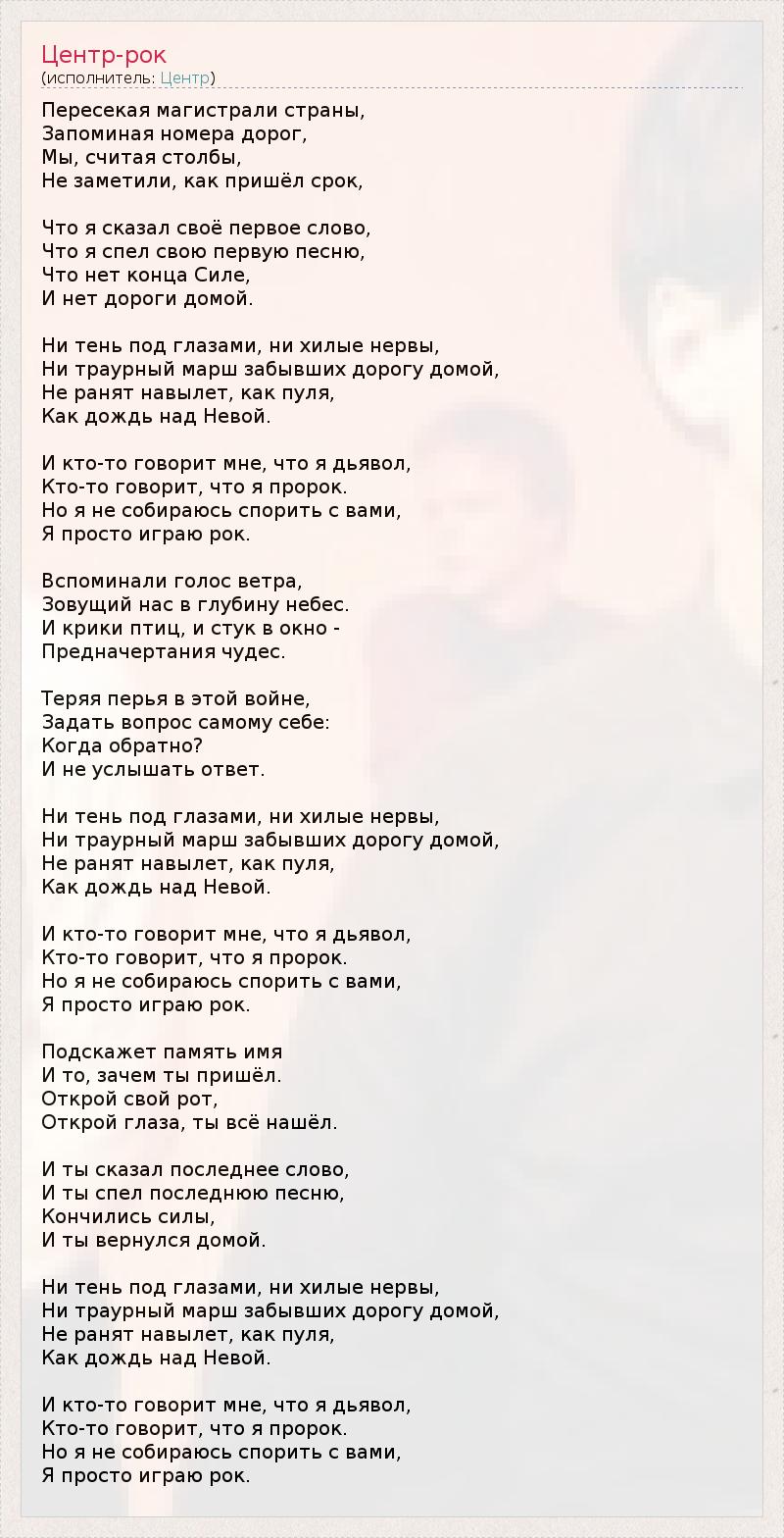 Пересекая магистрали страны, Запоминая номера дорог, Мы, считая столбы, Не заметили, как пришёл срок, Что я сказал своё первое слово, Что я спел свою первую песню, Что нет конца Силе, И нет дороги домой. Ни тень под глазами, ни хилые нервы, Ни траурный марш забывших дорогу домой, Не ранят навылет, как пуля, Как дождь над Невой. И кто-то говорит мне, что я дьявол, Кто-то говорит, что я пророк. Но я не собираюсь спорить с вами, Я просто играю рок. Вспоминали голос ветра, Зовущий нас в глубину небес. И крики птиц, и стук в окно - Предначертания чудес. Теряя перья в этой войне, Задать вопрос самому себе: Когда обратно? И не услышать ответ. Ни тень под глазами, ни хилые нервы, Ни траурный марш забывших дорогу домой, Не ранят навылет, как пуля, Как дождь над Невой. И кто-то говорит мне, что я дьявол, Кто-то говорит, что я пророк. Но я не собираюсь спорить с вами, Я просто играю рок. Подскажет память имя И то, зачем ты пришёл. Открой свой рот, Открой глаза, ты всё нашёл. И ты сказал последнее слово, И ты спел последнюю песню, Кончились силы, И ты вернулся домой. Ни тень под глазами, ни хилые нервы, Ни траурный марш забывших дорогу домой, Не ранят навылет, как пуля, Как дождь над Невой. И кто-то говорит мне, что я дьявол, Кто-то говорит, что я пророк. Но я не собираюсь спорить с вами, Я просто играю рок.