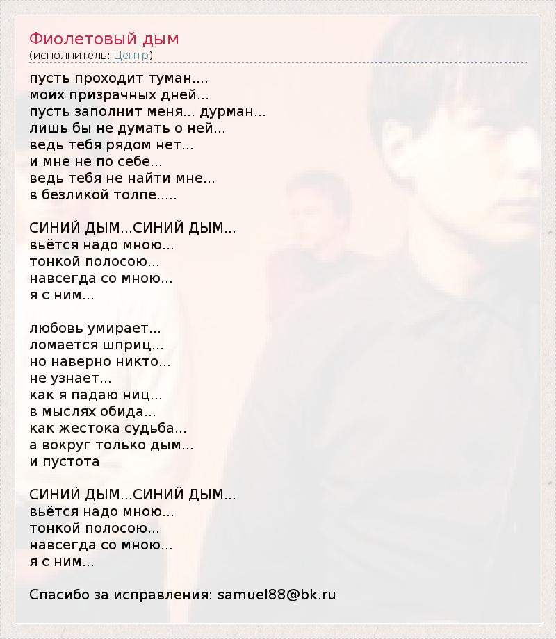 пусть проходит туман.... моих призрачных дней... пусть заполнит меня... дурман... лишь бы не думать о ней... ведь тебя рядом нет... и мне не по себе... ведь тебя не найти мне... в безликой толпе..... СИНИЙ ДЫМ...СИНИЙ ДЫМ... вьётся надо мною... тонкой полосою... навсегда со мною... я с ним... любовь умирает... ломается шприц... но наверно никто... не узнает... как я падаю ниц... в мыслях обида... как жестока судьба... а вокруг только дым... и пустота СИНИЙ ДЫМ...СИНИЙ ДЫМ... вьётся надо мною... тонкой полосою... навсегда со мною... я с ним... Спасибо за исправления: samuel88@bk.ru