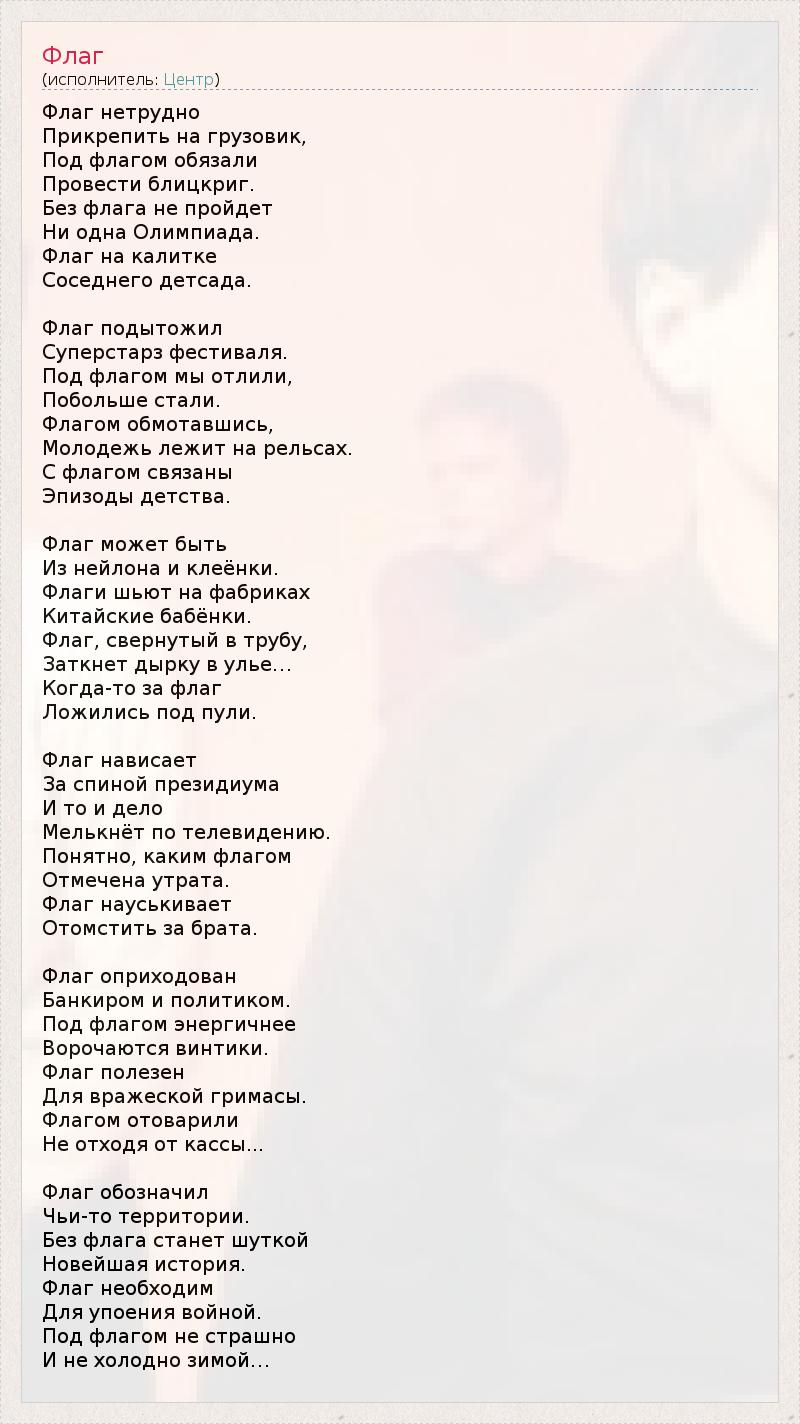 Флаг нетрудно Прикрепить на грузовик, Под флагом обязали Провести блицкриг. Без флага не пройдет Ни одна Олимпиада. Флаг на калитке Соседнего детсада. Флаг подытожил Суперстарз фестиваля. Под флагом мы отлили, Побольше стали. Флагом обмотавшись, Молодежь лежит на рельсах. С флагом связаны Эпизоды детства. Флаг может быть Из нейлона и клеёнки. Флаги шьют на фабриках Китайские бабёнки. Флаг, свернутый в трубу, Заткнет дырку в улье… Когда-то за флаг Ложились под пули. Флаг нависает За спиной президиума И то и дело Мелькнёт по телевидению. Понятно, каким флагом Отмечена утрата. Флаг науськивает Отомстить за брата. Флаг оприходован Банкиром и политиком. Под флагом энергичнее Ворочаются винтики. Флаг полезен Для вражеской гримасы. Флагом отоварили Не отходя от кассы... Флаг обозначил Чьи-то территории. Без флага станет шуткой Новейшая история. Флаг необходим Для упоения войной. Под флагом не страшно И не холодно зимой…