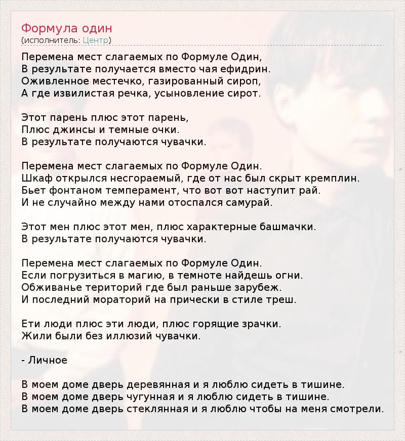 Перемена мест слагаемых по Формуле Один, В результате получается вместо чая ефидрин. Оживленное местечко, газированный сироп, А где извилистая речка, усыновление сирот. Этот парень плюс этот парень, Плюс джинсы и темные очки. В результате получаются чувачки. Перемена мест слагаемых по Формуле Один. Шкаф открылся несгораемый, где от нас был скрыт кремплин. Бьет фонтаном темперамент, что вот вот наступит рай. И не случайно между нами отоспался самурай. Этот мен плюс этот мен, плюс характерные башмачки. В результате получаются чувачки. Перемена мест слагаемых по Формуле Один. Если погрузиться в магию, в темноте найдешь огни. Обживанье територий где был раньше зарубеж. И последний мораторий на прически в стиле треш. Ети люди плюс эти люди, плюс горящие зрачки. Жили были без иллюзий чувачки. - Личное В моем доме дверь деревянная и я люблю сидеть в тишине. В моем доме дверь чугунная и я люблю сидеть в тишине. В моем доме дверь стеклянная и я люблю чтобы на меня смотрели.