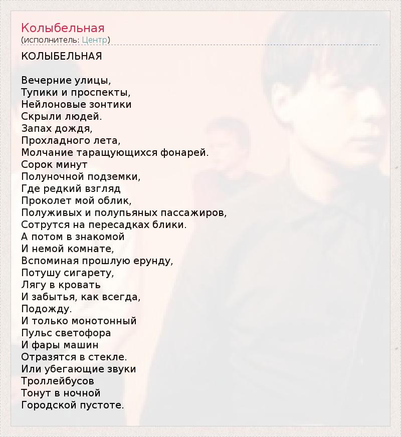 КОЛЫБЕЛЬНАЯ Вечерние улицы, Тупики и проспекты, Нейлоновые зонтики Скрыли людей. Запах дождя, Прохладного лета, Молчание таращующихся фонарей. Сорок минут Полуночной подземки, Где редкий взгляд Проколет мой облик, Полуживых и полупьяных пассажиров, Сотрутся на пересадках блики. А потом в знакомой И немой комнате, Вспоминая прошлую ерунду, Потушу сигарету, Лягу в кровать И забытья, как всегда, Подожду. И только монотонный Пульс светофора И фары машин Отразятся в стекле. Или убегающие звуки Троллейбусов Тонут в ночной Городской пустоте.